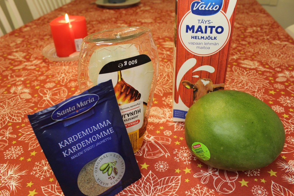 Add whole milk 3 to 6dl according to desired consistency and number of mangoes in use. More milk if you desire more runny, less if a thicker consistency is desired. The size of the mangoes in use may affect the amount of milk needed. Estimate accordingly.